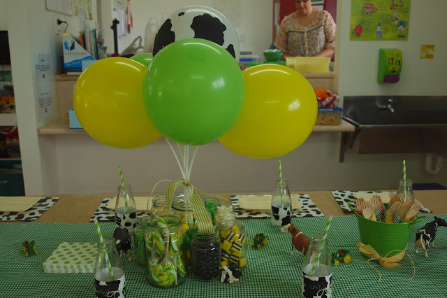 This was so cool to set up. Everything had to be farm related, hence the table cloth and checked fabric. All of the tableware was made of biodegradable wood (I'm a bit of a greenie). The placemats were made of card covered with cow print table runner paper. I also used it to wrap presents for prizes at game time and around the milk bottles, which I then decorated with a punched out label (to write a name on), twine and mini bull clips.